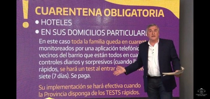 Señaló que “vamos a imponer una faja en la casa para informar a los vecinos que hay una familia está en cuarentena”, en alusión a las personas que regresen a la provincia y tengan antecedentes de viaje en el país y en el exterior”.