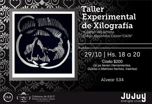 El Centro de Arte Joven Andino invita a participar al Taller Experimental de Xilografía que tendrá lugar mañana, martes 29, de 18 a 20 horas, a cargo del Diego Alejandro Cazón (CAIN). Se solicita que aquellos participantes que tengan herramientas, gubias o matrices hechas, las lleven para realizar el taller. Para consultar en dicho centro, ubicado en Alvear 534 o al teléfono N° 4249304.