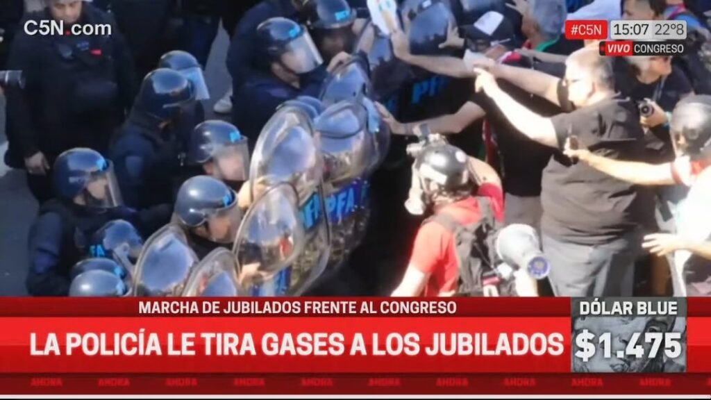 Los manifestantes, en su mayoría adultos mayores, estaban concentrados en la vereda, pero los uniformados los presionaron hasta subir sobre ella, golpeando y gaseando a varios. Las imágenes difundidas muestran a jubilados con dificultades para abrir los ojos, asistidos por el personal de primeros auxilios presente en el lugar.