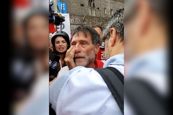 “Se abusan de nosotros y sale a reprimir. Nos tiran gases. Nos tiraron al piso, me pisó uno. Nosotros venimos con un cartel, no venimos con armas. Me pisaron la mano”, señaló jubilado de 73 años que estaba en la marcha.