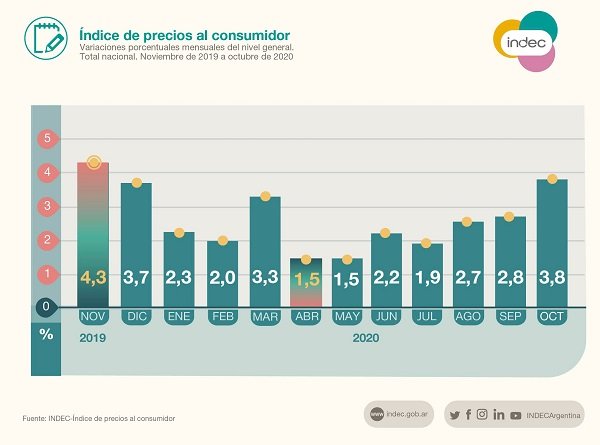 En los primeros diez meses del 2020 la suba de precios acumuló 26,9%, según el Indec, mientras que la inflación interanual (últimos 12 meses) acumula un incremento del 37,2%.