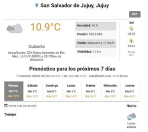En San Salvador de Jujuy, se anunció una mínima de 3° y máxima de 13°C para hoy y este domingo 0°C de mínima y 14°C de máxima.