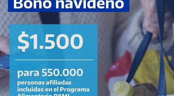 El Instituto Nacional de Servicios Sociales para Jubilados y Pensionados (PAMI) otorgará un bono navideño de $1.500 para sus 550.000 afiliados destinatarios del Programa Alimentario, además de otro de $10.000 para centros de jubilados y pensionados de todo el país.