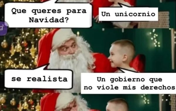 La escena es simple: un niño pide un unicornio; Papá Noel, con el pragmatismo de un ajustador serial, le pide que sea «realista». Pero cuando el pibe baja a tierra y pide «un gobierno que no viole mis derechos», Santa —que parece haber leído el manual de Caputo— no lo duda: «¿De qué color querés el unicornio?».