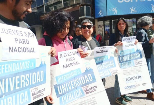 La Asociación de Docentes e Investigadores de la Universidad Nacional de Jujuy (Adiunju), como parte de las acciones de visibilización, realizaron un cartelazo en el ingreso a la peatonal Belgrano.