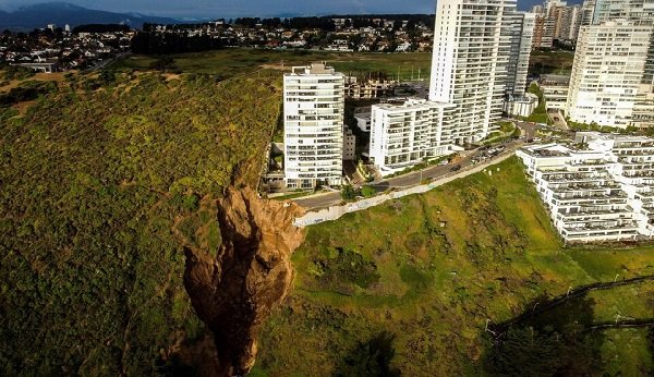 El enorme socavón que se abrió sobre la avenida Borgoño en la región de Valparaíso, en Chile, como consecuencia de …