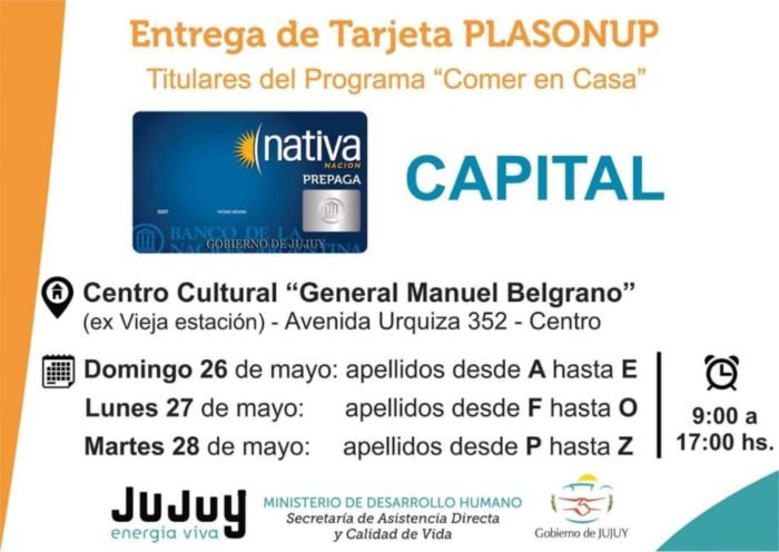 En ese sentido destacó que la distribución de las tarjetas se cumplirá en Capital en el Centro Cultural General Belgrano (ex Estación del Ferrocarril) el día domingo 26 para los beneficiarios con apellidos comprendidos entre las letras “A” hasta la “E”; el lunes 27 los de apellidos entre las letras “F” hasta “O” y el martes 28, los comprendidos entre las letras “P” a la “Z”.