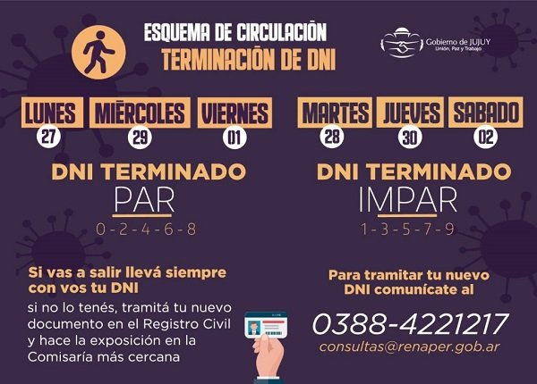 Cada persona deberá cumplir con el protocolo difundido oportunamente y poseer el DNI, en caso de no tenerlo se podrá tramitar uno nuevo haciendo la correspondiente exposición en la comisaría más cercana, dirigiéndose al Registro Civil, llamando al 0388-4221217 o enviando un mail a consultas@renaper.gob.ar.