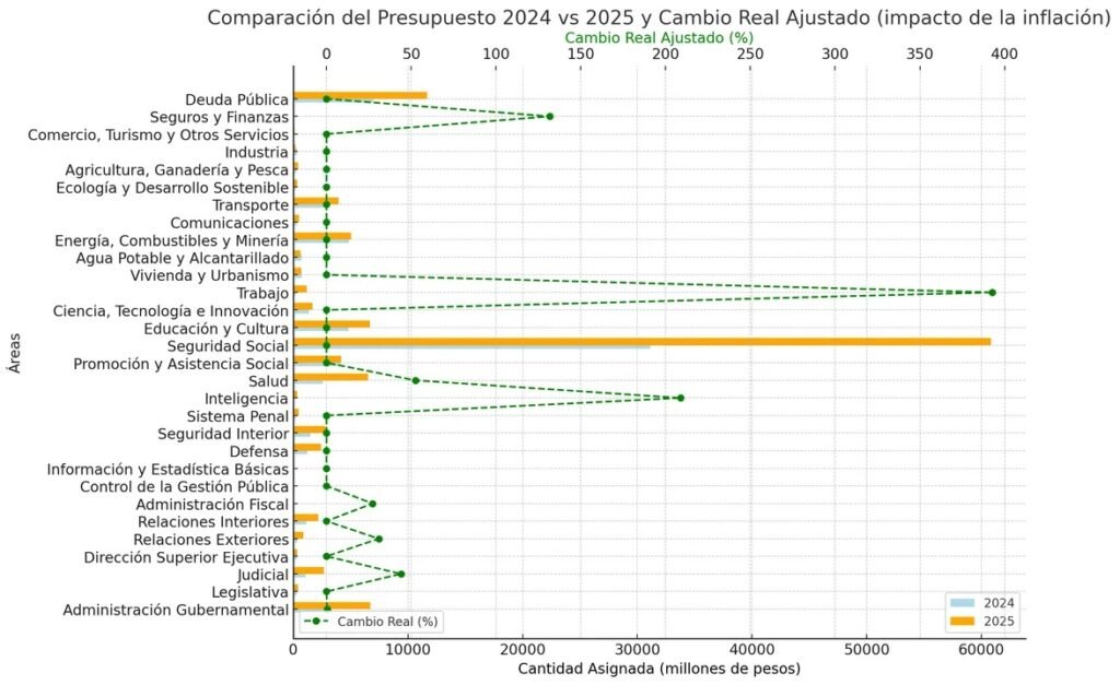 - Relaciones Exteriores: Con un aumento del 30% en términos reales, esta área recibe un impulso considerable, lo que podría estar vinculado a la estrategia de internacionalización del gobierno.