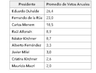 Para medir la intensidad del conflicto entre poderes, el indicador más preciso es el promedio de vetos por año de mandato. Bajo esta métrica, el ránking muestra que los períodos de mayor crisis son los que registran un uso más frenético de esta herramienta: