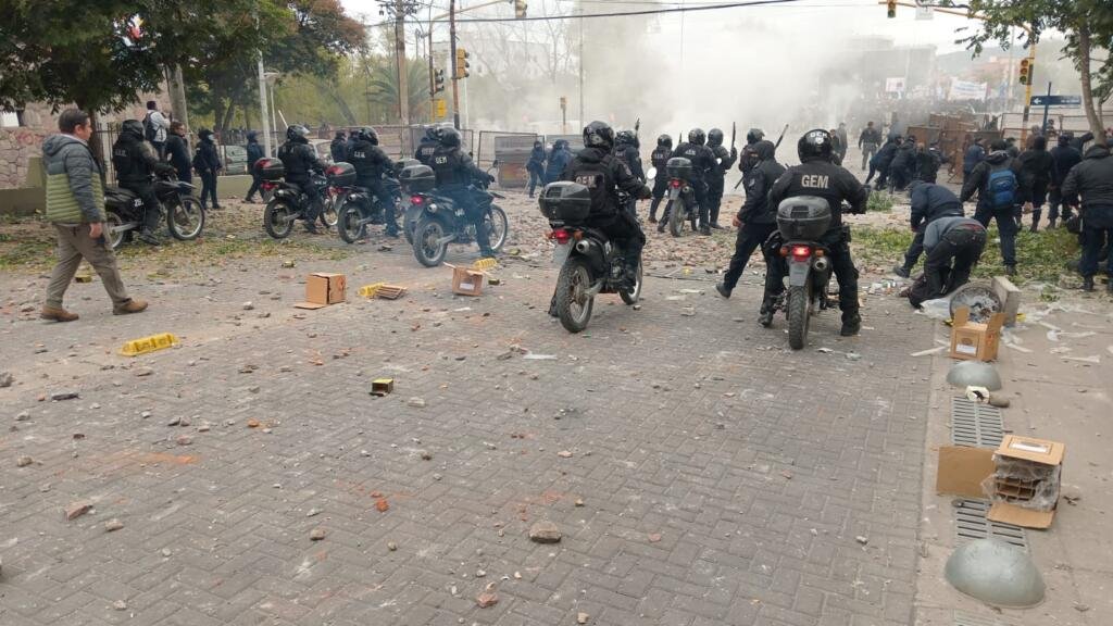 El avance policial comenzó poco después de las 11 contra una nueva y multitudinaria marcha que congregó a múltiples sectores de la sociedad en la capital jujeña contra la reforma en las puertas de la Legislatura, mientras en su interior se aprobaba y juraba la nueva Carta Magna local.