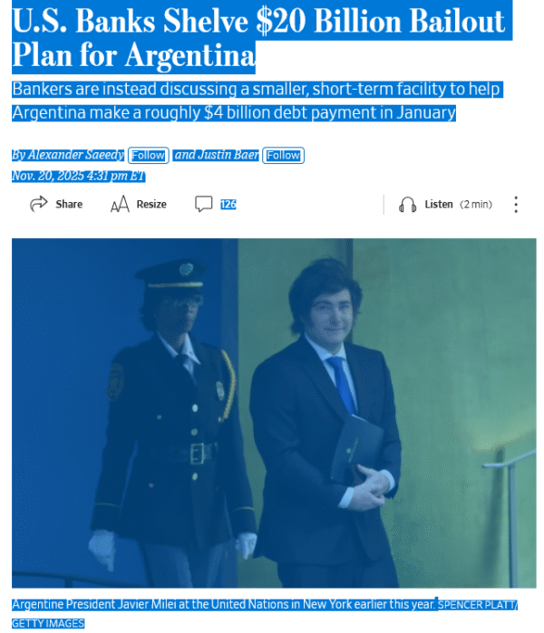 El WSJ también pone la lupa sobre el mecanismo utilizado por Trump para rescatar a Milei. “Exfuncionarios del Tesoro criticaron públicamente la falta de transparencia del respaldo financiero brindado a la Argentina, señalando que se aparta de prácticas de décadas anteriores, como las implementadas para asistir a México en los años 90″, consigna el medio financiero.