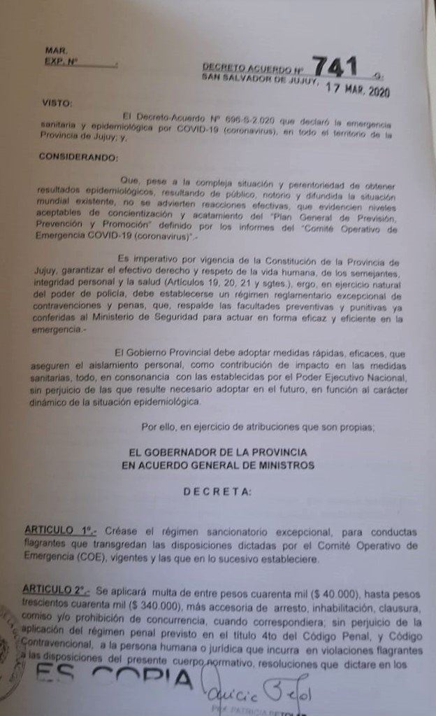 El Ejecutivo Provincial dio a conocer el Decreto Acuerdo N° 741 -G- por el cual se crea el régimen sancionatorio excepcional para conductas flagrantes que transgredan las disposiciones dictadas por el Comité Operativo de Emergencia.