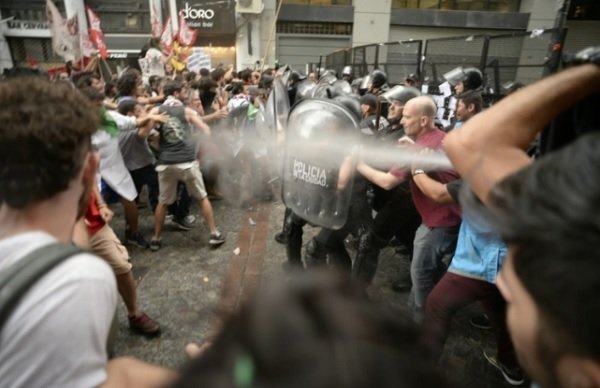 Mientras adentro del recinto el macirsmo se disponía a aprobar la norma, afuera la Policía de la Ciudad avanzó a con gases y palazos sobre la multitud de estudiantes terciarios y docentes que se movilizaron contra la aprobación del proyecto. Hubo varios heridos, entre ellos un joven esudiante que recibió un palazo en la cabeza.