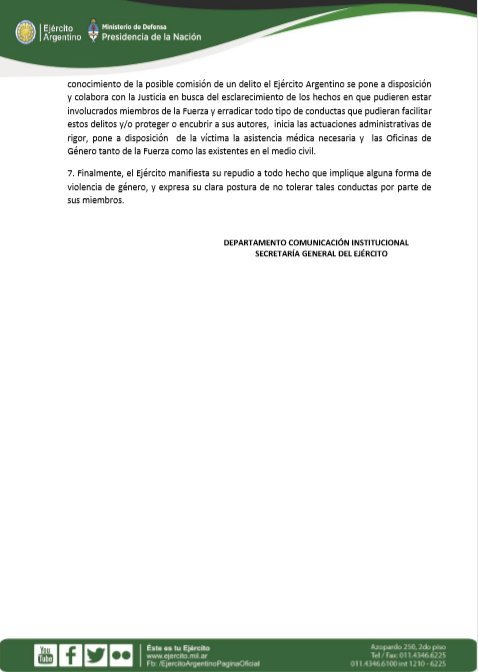 En el parte oficial, emitido por el Departamento de Comunicación Institucional del Ejército, manifiestan su repudio a todo hecho que implique alguna forma de violencia de género y expresan su clara postura de no tolerar tales conductas por parte de sus miembros poniéndose a disposición de la justicia para avanzar con cualquier investigación.