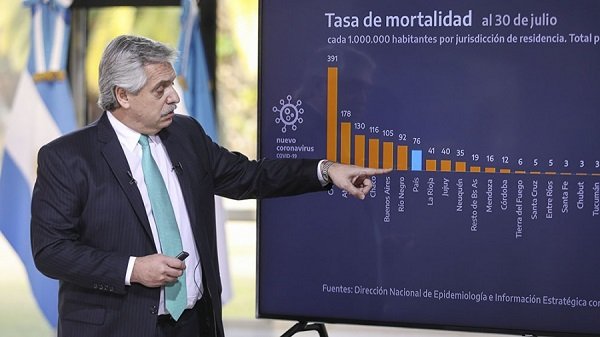 El presidente de la Nación, Alberto Fernández pidió hoy «mayor responsabilidad» y «más cuidado» a todos los argentinos al anunciar la extensión de la cuarentena hasta el 16 de agosto para mitigar el contagio de coronavirus en el marco de la pandemia.