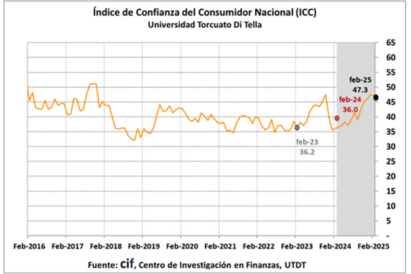 El Índice de Confianza del Consumidor (ICC) presentó en febrero su primera caída en cinco meses, con una baja del 0,3% respecto a enero, según el informe del Centro de Investigación en Finanzas de la Escuela de Negocios de la Universidad Torcuato Di Tella. Sin embargo, en términos interanuales, el indicador muestra un aumento del 31,13%.