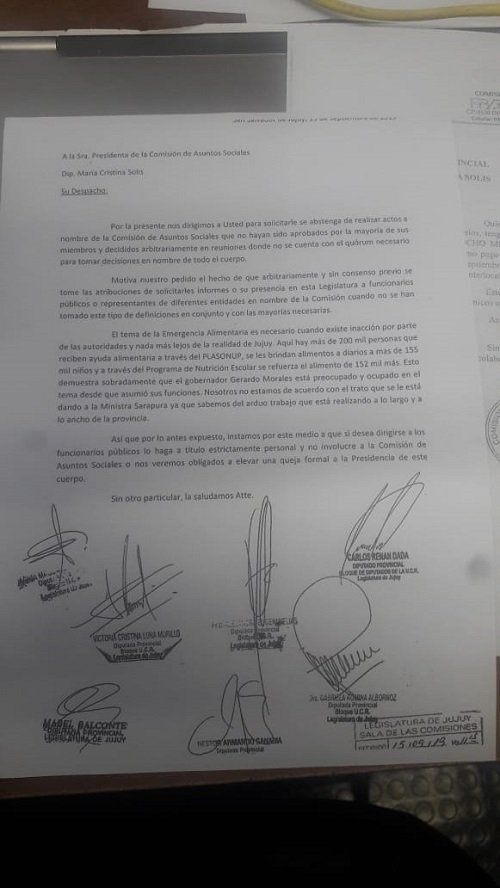 Cabe resaltar que, en la reunión de la comisión, se esperaba la presencia del obispo de Jujuy, Monseñor César Daniel Fernández y de la ministra de Desarrollo Humano, Natalia Sarapura, pero se ausentaron sin aviso.