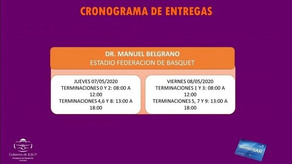 La presentación del cronograma de entrega lo realizó la ministra Natalia Sarapura quien señaló que el operativo solo incluirá la entrega de tarjetas a los beneficiarios titulares por lo “no se recibirá ningún tipo de consultas”, para tal fin se dispuso de diferentes vías de contacto para obtener información: ANSES 130; Ministerio de Desarrollo Social de la Nación 0800 222 3294; Ministerio de Desarrollo Humano 388 4635322 / 5064154 consultasdesarrollojujuy@gmail.com.