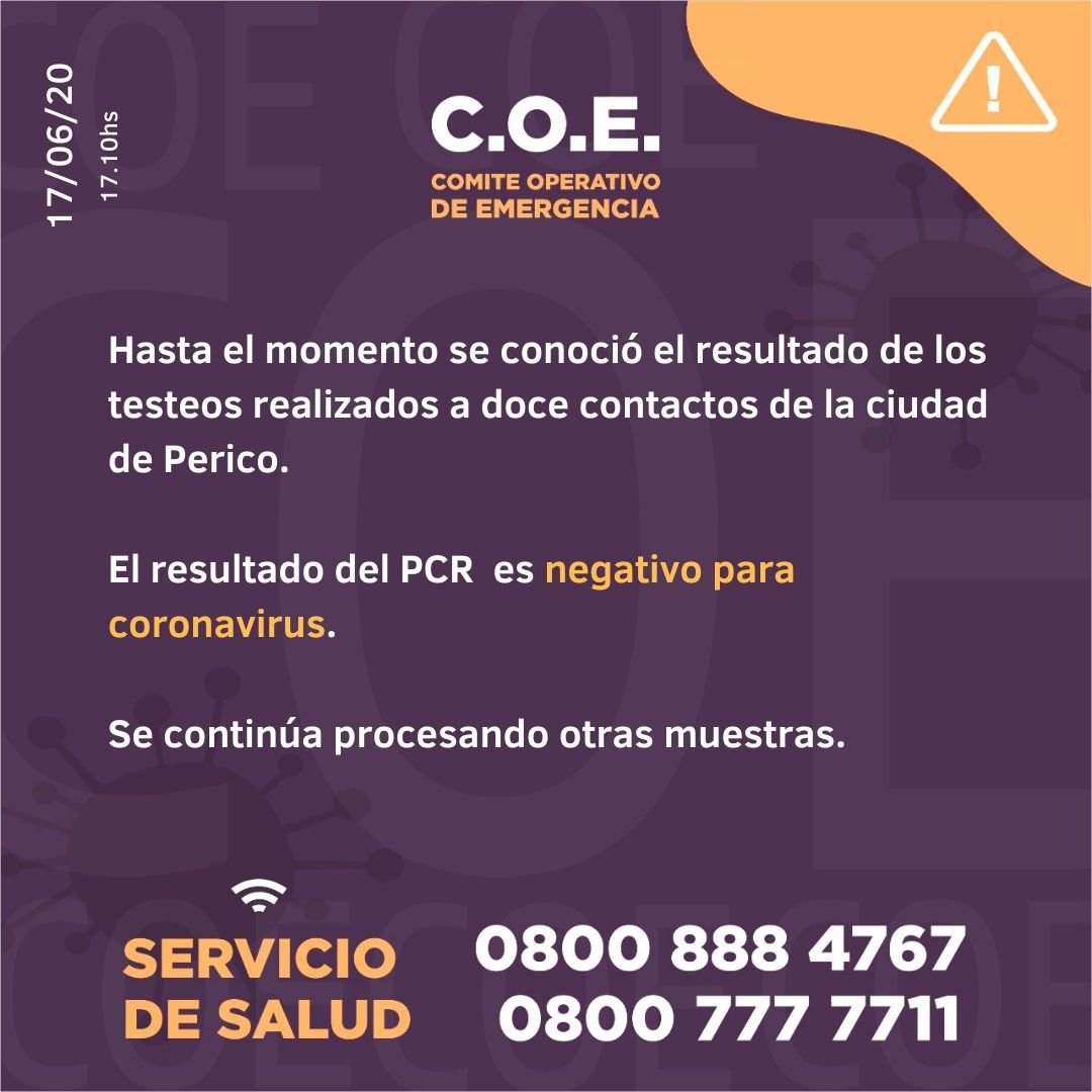 El COE informó que fueron testeadas una docena de personas en Perico y el resultado fue negativo del Sars Covid-19. El organismo afirmó que seguirán realizando pruebas en el Gran Jujuy. También aseguró que realizarán un operativo «casa por casa» en barrio capitalino de Villa Belgrano.