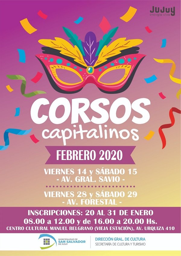La Municipalidad de San Salvador de Jujuy informa a las comparsas que son los últimos días de inscripción para participar de los corsos capitalinos que se llevarán a cabo, los días 14, 15, 28 y el 29 de febrero. Las dos primeras jornadas se realizarán sobre la avenida Savio y las restantes sobre la avenida Forestal.