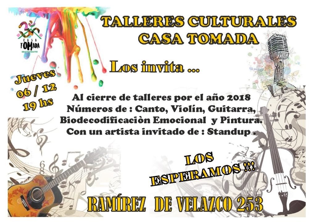 Este jueves se llevará a cabo la muestra y cierre de los Talleres Culturales en Casa Tomada por el año 2018. La misma se hará desde las 19.30 horas en dicha sede.