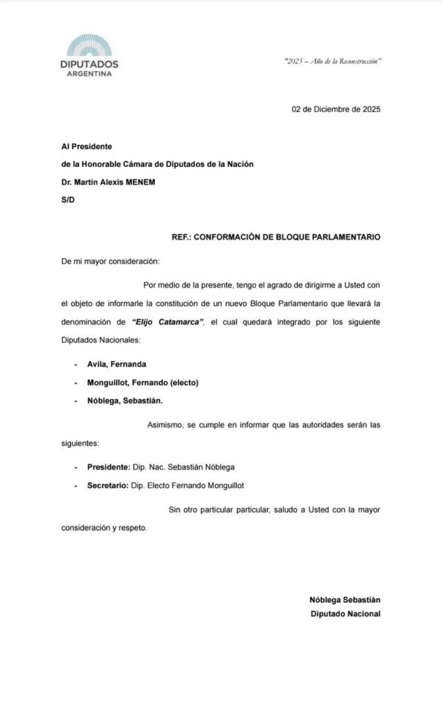 Los tres representantes de Catamarca: Fernando Monguillot, Fernanda Ávila y Sebastián Nóblega, quien presentó la nota de armado de un nuevo bloque, que se llamará Elijo Catamarca. Aún no está definido si se sumará al interbloque de los gobernadores, que lidera el mandatario salteño Gustavo Sáenz. Permanece en el peronismo la diputada catamarqueña Claudia Palladino.