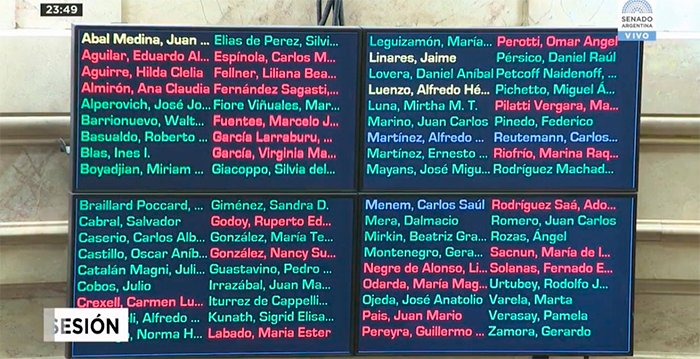 El orden alfabético dejó en primera fila a Juan Abal Medina, uno de los únicos tres senadores que eligieron abstenerse de apoyar o rechazar el proyecto de reforma previsional al cual el Senado le dio media sanción segundos antes de la medianoche. El resto, separados mayormente en tipografías luminosas rojas y verdes, aparecieron más abajo en el panel de legisladores que participaron de la sesión.