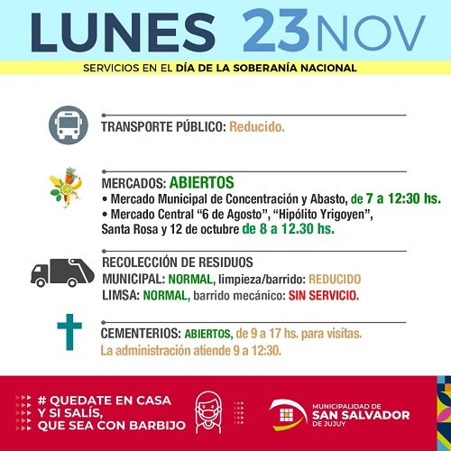 La Municipalidad de San Salvador de Jujuy informa a la opinión pública como será la modalidad de los servicios que brindará, durante este lunes que es feriado nacional porque se conmemora un nuevo aniversario por el Día de la Soberanía Nacional.