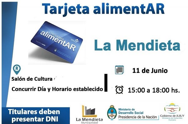 Este martes sigue la entrega de Tarjetas AlimentAR del Ministerio de Desarrollo Social de la Nación en un operativo organizado por el Ministerio de Desarrollo Humano de Jujuy en coordinación con las diez intendencias y comisiones municipales del Ramal donde se concretará la entrega hasta el viernes 12: El Fuerte, Santa Clara, La Esperanza, El Piquete, Arrayanal, Fraile Pintado, La Mendieta, Rodeíto, Rosario de Río Grande y Calilegua.