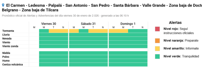 De acuerdo a la información oficial las áreas afectadas comprenden la totalidad del territorio jujeño, las zonas de Puna, Quebrada, Valles y Yungas. Las fuertes tormentas se desarrollarán durante la tarde-noche de este jueves.