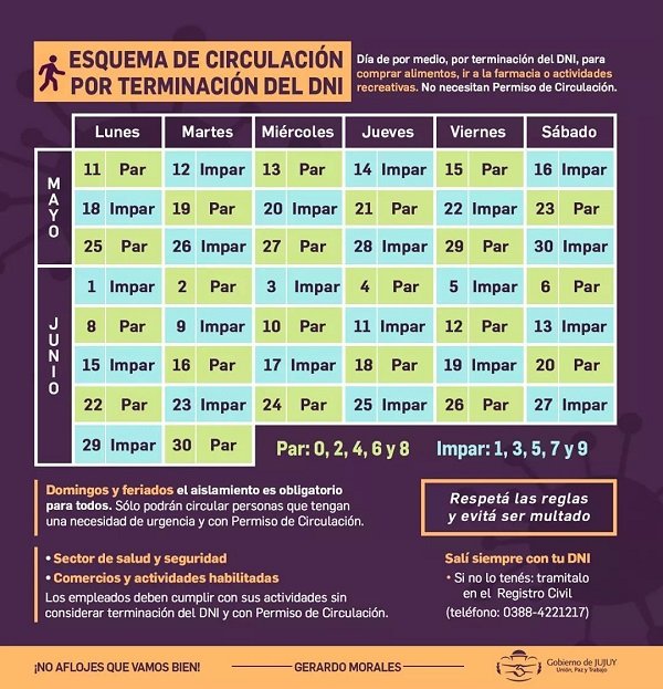 Las personas con terminación de DNI en número par iniciarán esta semana con las salidas permitidas. De acuerdo al esquema de circulación emitido por el gobierno de la provincia, el lunes, miércoles y viernes, estarán habilitadas las salidas para los pares.