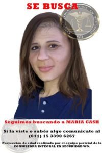 María Cash fue captada por última vez por una cámara de seguridad en el acceso a la ciudad de Salta, aunque después otros testigos declararon que se trasladó a la ciudad de General Güemes y ahí fue vista haciendo dedo con sentido hacia el sur.