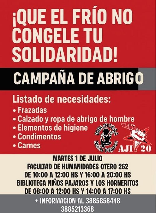 En la Facultad de Humanidades y Ciencias Sociales de la UNJU (Otero 262) estarán recibiendo donaciones de frazadas, calzado y ropa de abrigo de hombre, elementos de higiene, condimentos y carnes, de 10 a 12 y de 16 a 20 horas. En la Biblioteca Niños Pájaros y Horneritos, de 8 a 12 y de 14 a 17.