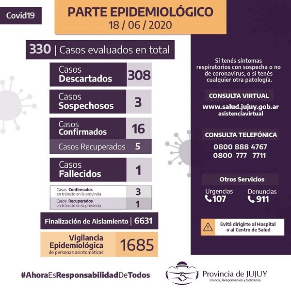Desde el inicio de la cuarente, se evaluaron 330 casos, y se descartaron 308. Hay 3 casos sospechosos en estudio, y se registran hasta la fecha 19 casos confirmados, recordando que 5 de ellos ya se encuentran recuperados y en sus domicilios. Los casos confirmados en tránsito son 3, con un caso recuperado. Y un caso fallecido.