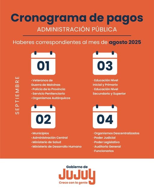 El gobierno de Jujuy informa a la opinión púiblica que este lunes comenzó el cronograma de pagos correspondiente al mes de agosto de 2025.