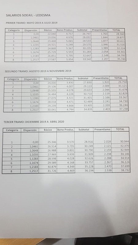 La tabla salarial, surgida de la doble jornada de intensas negociaciones llevadas a cabo la semana pasada entre la dirigencia sindical y la representación de la compañía azucarera, quedó confeccionada de la siguiente manera (siempre teniendo como referencia a la Categoría 1):