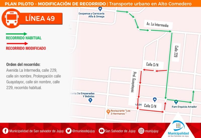 En razón de la realización del Plan de Mejoramiento del Servicio de Transporte Urbano de pasajeros, en Barrio Alto Comedero, sector Bicentenario – SEOM, a partir del sábado 9 de marzo, se llevará a cabo un Plan Piloto modificando el recorrido.