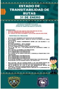La Dirección provincial de Tránsito y Seguridad Vial, informó el estado de transitabilidad de las rutas en la provincia correspondiente a este viernes, con algunos sectores afectados por crecidas de ríos, desmoramiento de cerros, acumulación de sedimentos.