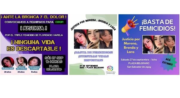 Colectivos feministas, organismos de derechos humanos y organizaciones sociales convocan a marchar este sábado en San Salvador de Jujuy en repudio al triple femicidio de Florencio Varela, que tuvo como víctimas a Brenda Del Castillo, Morena Verdi y Lara Gutiérrez.