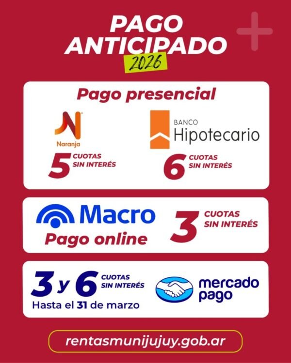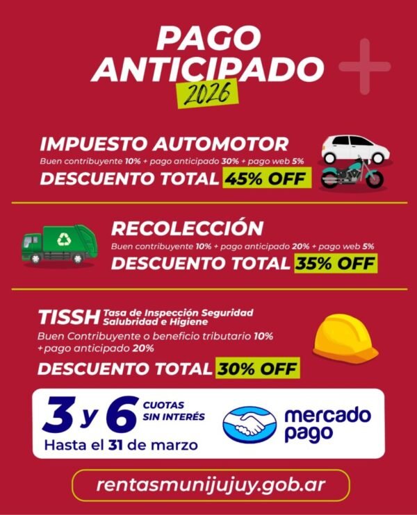 La Municipalidad de San Salvador de Jujuy recuerda a los contribuyentes que el martes, 31 de marzo, vence el plazo para adherir al Plan de Pago Anticipado de impuestos y tasas municipales 2026 que, como en anteriores periodos, prevé facilidades de pago e importantes descuentos para quienes adhieran al mencionado esquema, sean contribuyentes cumplidores y cancelen sus deudas mediante el sitio web oficial del municipio.