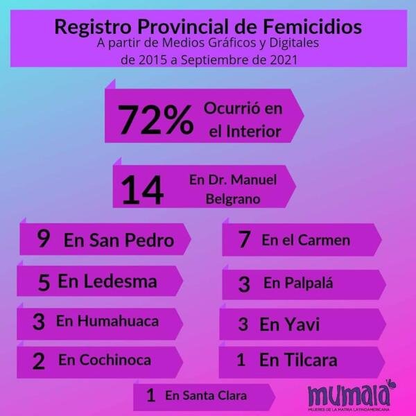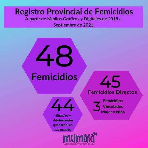 Desde el observatorio MuMaLá Jujuy (Mujeres de la Matria Latinoamericana) en las últimas horas publicó en sus redes sociales que se produjeron 48 femicidios en la provincia, desde el 2015 hasta la fecha.