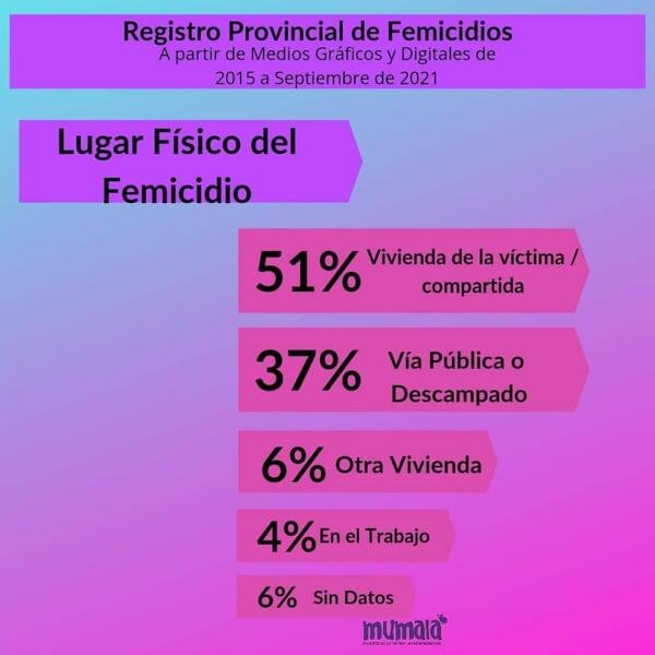El 51% de los femicidios sucedido en la casa de la víctima o compartida con el femicida; el 37% en la vía pública o descampado; el 6% en otra vivienda; el 4% en el ambiente laboral y el 6% sin datos.