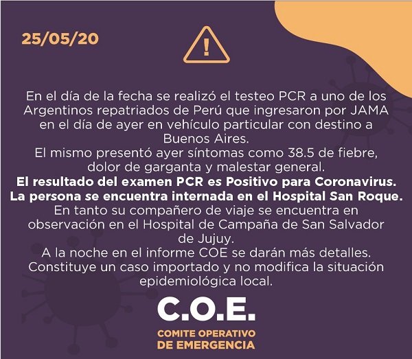 El Comité Operativo de Emergencia (COE) informó que uno de los argentinos repatriados que ingresó por el Paso de Jama este lunes con destino a Buenos Aires, dio positivo para coronavirus en el test PCR realizado en la provincia. Está internado en el hospital San Roque.