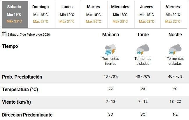 El área será afectada por tormentas aisladas, pudiendo ser algunas fuertes. Las mismas podrán estar acompañadas por caída de granizo, actividad eléctrica intensa, precipitación abundante en cortos períodos y ráfagas que pueden alcanzar los 70 km/h. Se prevén valores de precipitación acumulada entre 30 y 50 mm, pudiendo ser superados de manera local.