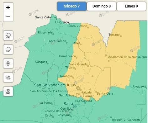 El Servicio Meteorológico Nacional emitió alerta amarilla para este sábado, hasta la tarde, en las zonas de El Carmen – Ledesma – Palpalá – San Antonio – San Pedro – Santa Bárbara – Valle Grande – Zona baja de Doctor Manuel Belgrano – Zona baja de Tilcara y Zona montañosa de Doctor Manuel Belgrano – Zona montañosa de Humahuaca – Zona montañosa de Tilcara – Zona montañosa de Tumbaya.