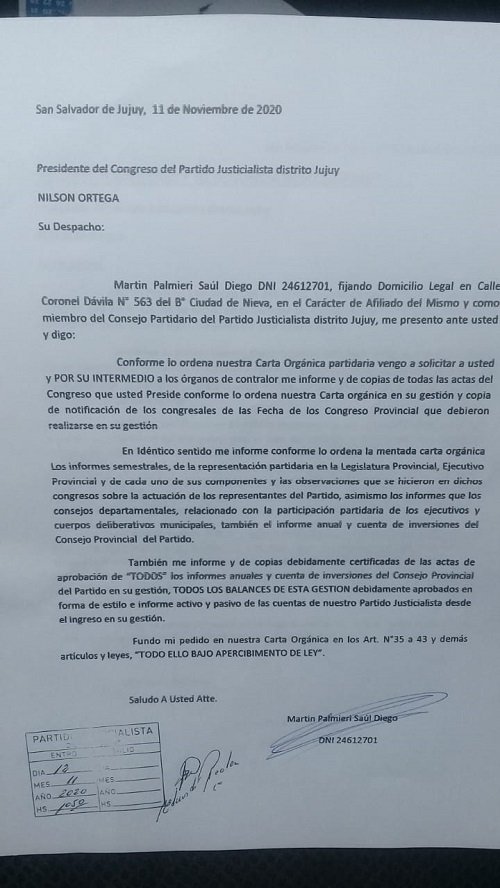 Un consejero del Partido Justicialista, presentó una nota en la sede partidaria, para exigir elecciones internas, para dirimir cargos electivos y cargos partidarios. Además solicita la renuncia del presidente del partido y rendición de cuentas al titular del Congreso partidario.