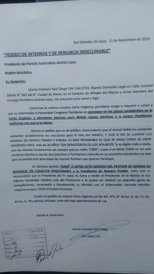En un comunicado de prensa, Palmieri afirma que “acabo de presentar formalmente el pedido de internas en el PJ jujeño y la renuncia indeclinable del presidente del partido justicialista distrito Jujuy. Hace más de 20 años que no hay participación democrática en nuestra herramienta electoral y está muy claro la sociedad que tiene Rivarola con el gobernador de Jujuy, Gerardo Morales, que somete a los afiliados, no tenemos nada que ver los peronistas con semejante papelón”.