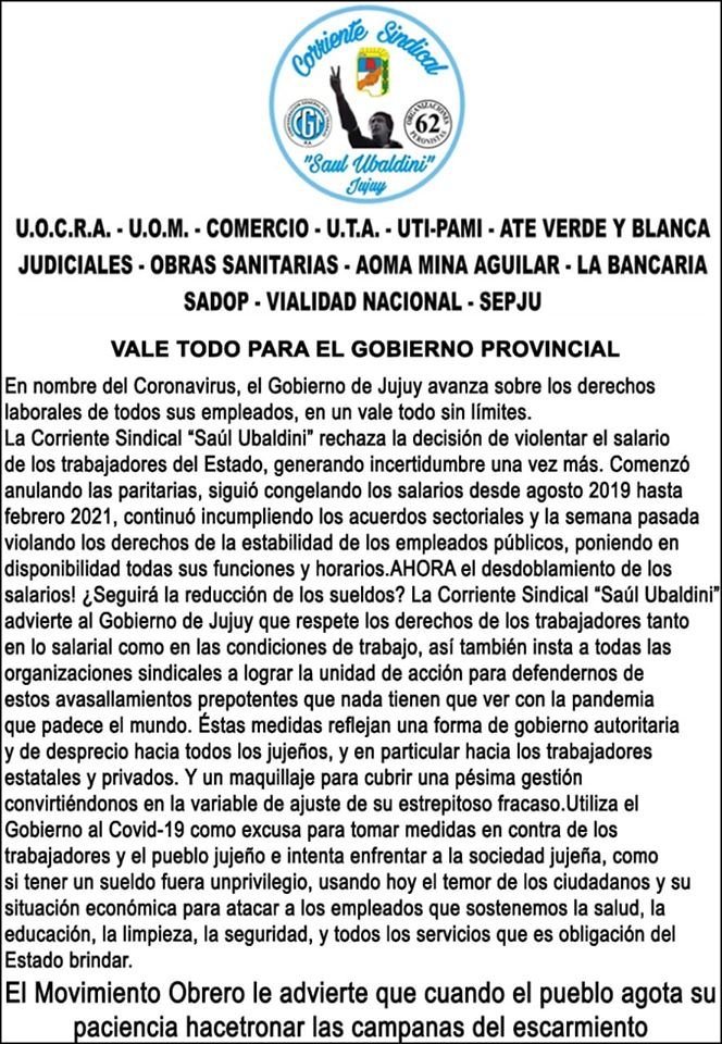 Los gremios nucleados en la “Ubaldini” son: UOCRA, UOM, Centro de Empleados de Comercio, UTA, UTI-PAMI; ATE verde y blanca, Judiciales, Obras Sanitarias, AOMA Mina Aguilar; La Bancaria, SADOP, Vialidad Nacional y SEPJU, quienes expresaron que “en nombre del coronavirus, el gobierno de Jujuy avanza sobre los derechos laborales de todos sus empleados, en un vale todo sin límites”.