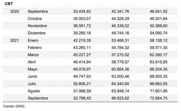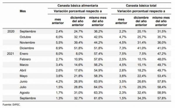 En el informe del organismo local, señala que la Canasta Básica Total (CBT) aumentó en septiembre un 1,5% respecto a agosto y en lo que va del año acumula un incremento del 34,3%.